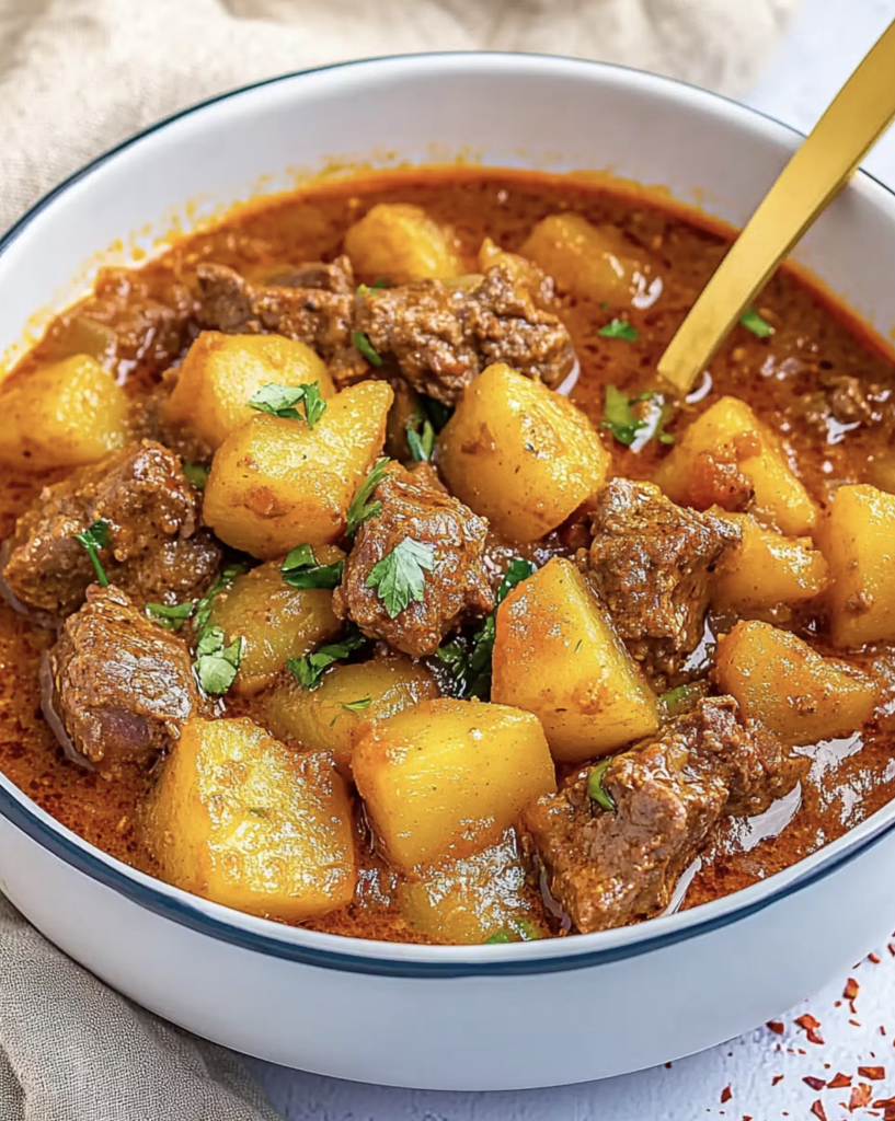 Una de las razones por las que esta receta es tan apreciada es su sencillez. No requiere técnicas complicadas ni utensilios especiales. Con ingredientes comunes y un poco de tiempo de cocción, se obtiene un guiso profundo y delicioso en el que cada ingrediente aporta su carácter: la carne aporta riqueza y textura, las papas absorben la salsa y las especias crean un aroma cálido y equilibrado.