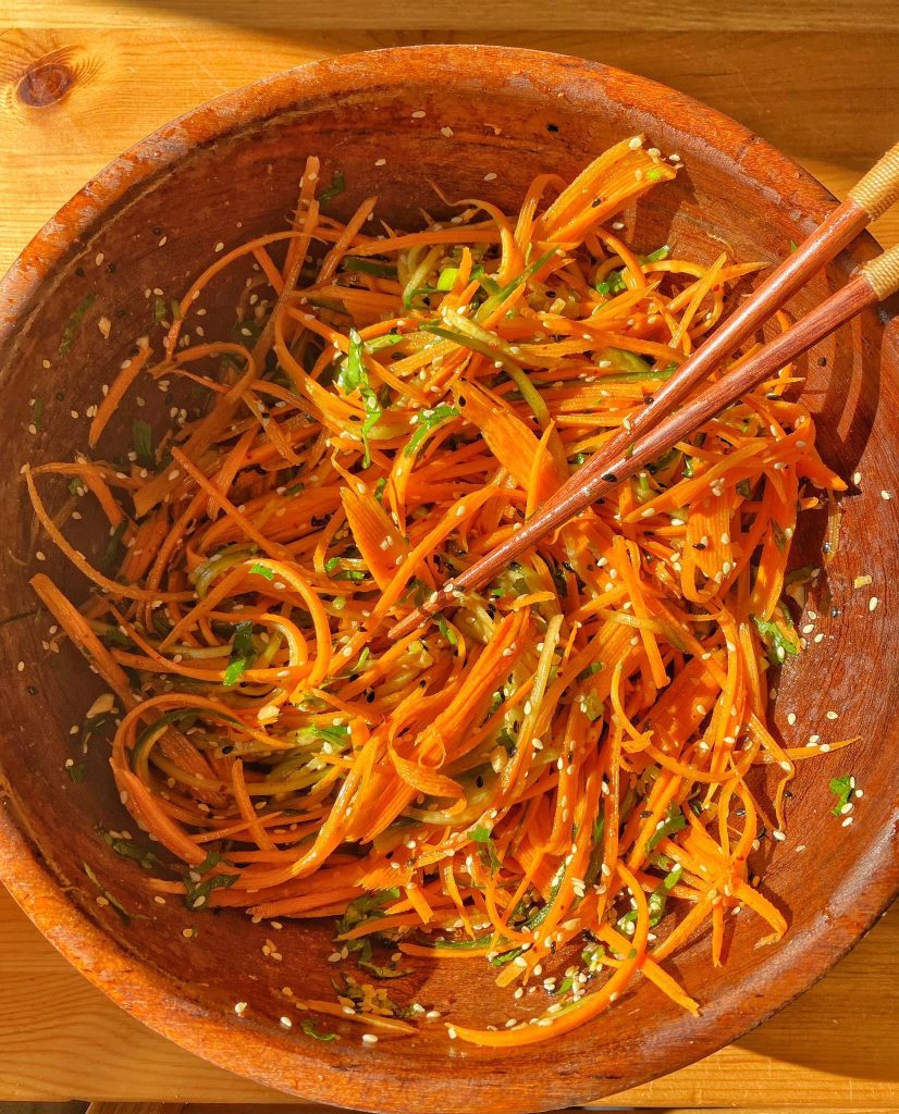 Al momento de servir, revuelve nuevamente con un movimiento suave y presenta la ensalada en platos individuales o en una fuente grande si la vas a compartir. El contraste de colores entre el verde del pepino, el naranja de la zanahoria y las semillas doradas hará que el plato luzca tan bien como sabe.