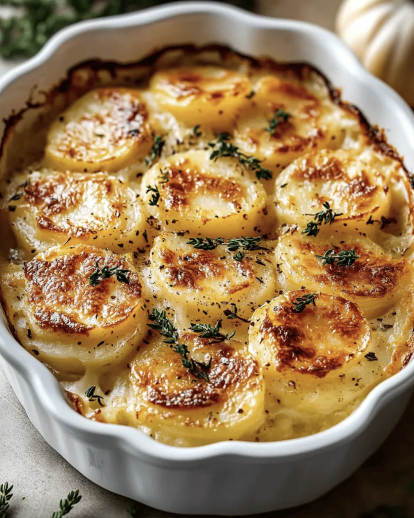 Una receta clásica que combina sencillez y elegancia, perfecta como acompañamiento para una comida especial o como plato principal en una cena reconfortante. Las papas gratinadas cremosas son un deleite por su textura suave, su cubierta dorada y crujiente, y el sabor envolvente de la crema, el queso y las hierbas aromáticas.