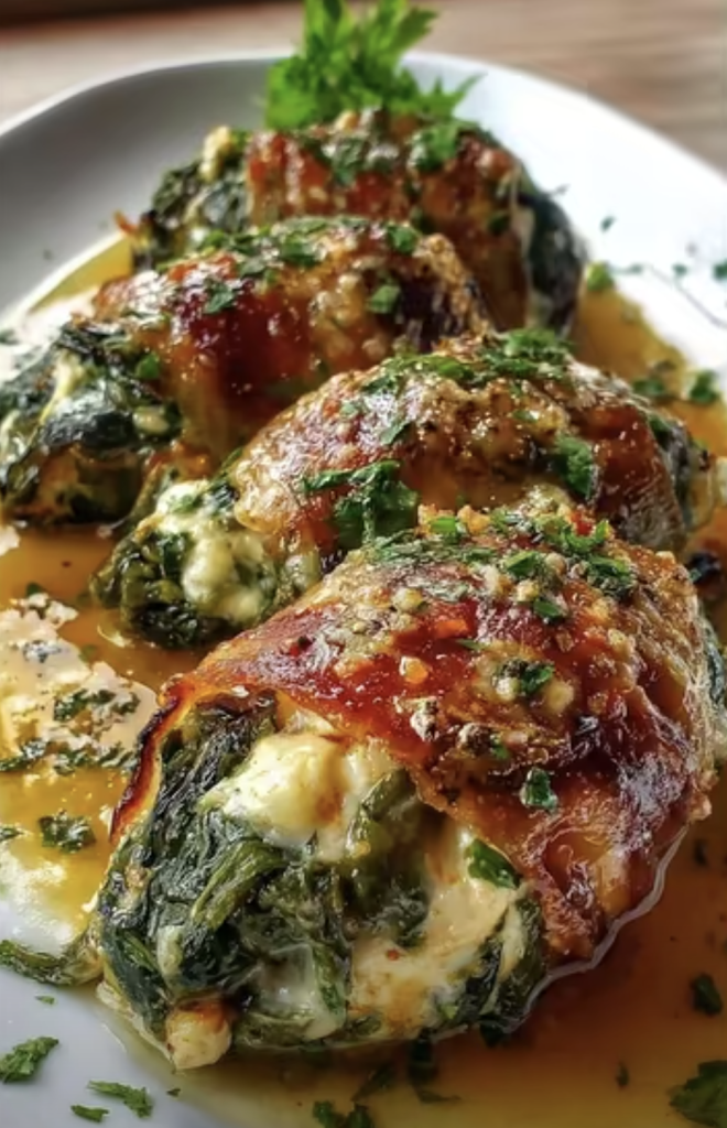 Esta receta de pollo relleno de espinacas y queso es un plato principal que combina la jugosidad de las pechugas de pollo con un relleno cremoso y sabroso de espinacas frescas y queso. El resultado es un plato elegante y reconfortante, ideal tanto para una cena familiar como para una ocasión especial. El contraste entre la carne tierna y el interior suave y aromático hace que cada bocado sea una experiencia deliciosa y memorable.