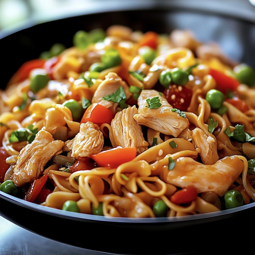 Agrega los fideos ya cocidos y escurridos directamente al wok. Con ayuda de unas pinzas o una espátula, mezcla cuidadosamente todos los ingredientes para que los fideos se integren con el pollo y las verduras. Asegúrate de que absorban la salsa y los sabores del salteado. Continúa cocinando durante 1 a 2 minutos adicionales, removiendo constantemente, hasta que todo esté bien caliente y perfectamente combinado. - Servir