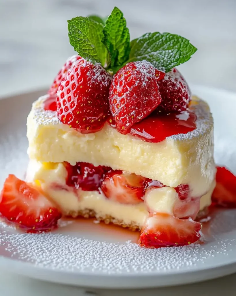 Aquí tienes una versión más larga, detallada y descriptiva de la receta del Pastel de Delicia de Natillas de Fresa, manteniendo todos los ingredientes y pasos originales sin omitir nada ni añadir nuevos elementos.
